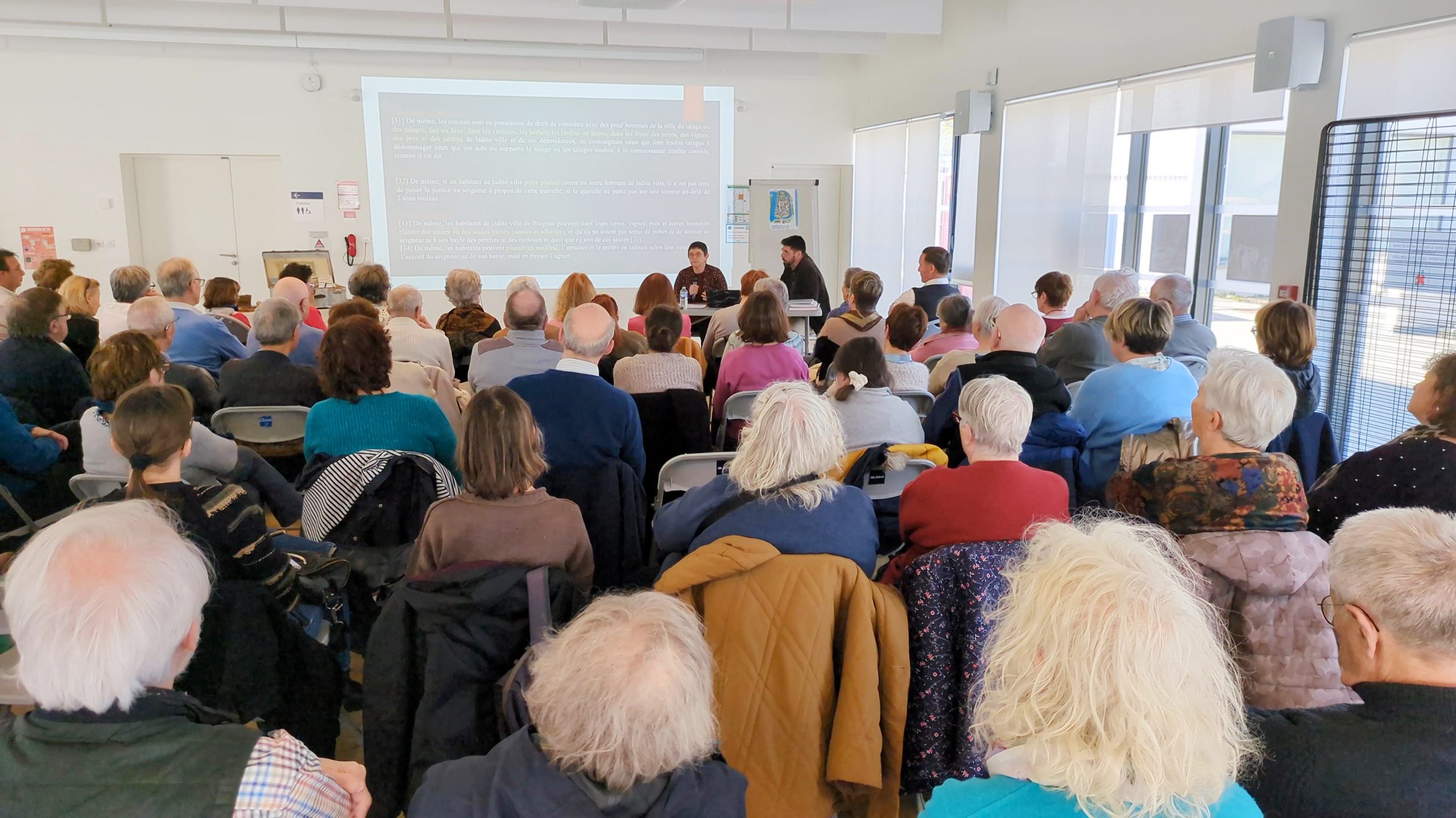 En présence de 8O personnes, les historiens Hélène Debax et Roland Viader ont présenté les coutumes de Blagnac récemment découvertes.